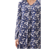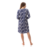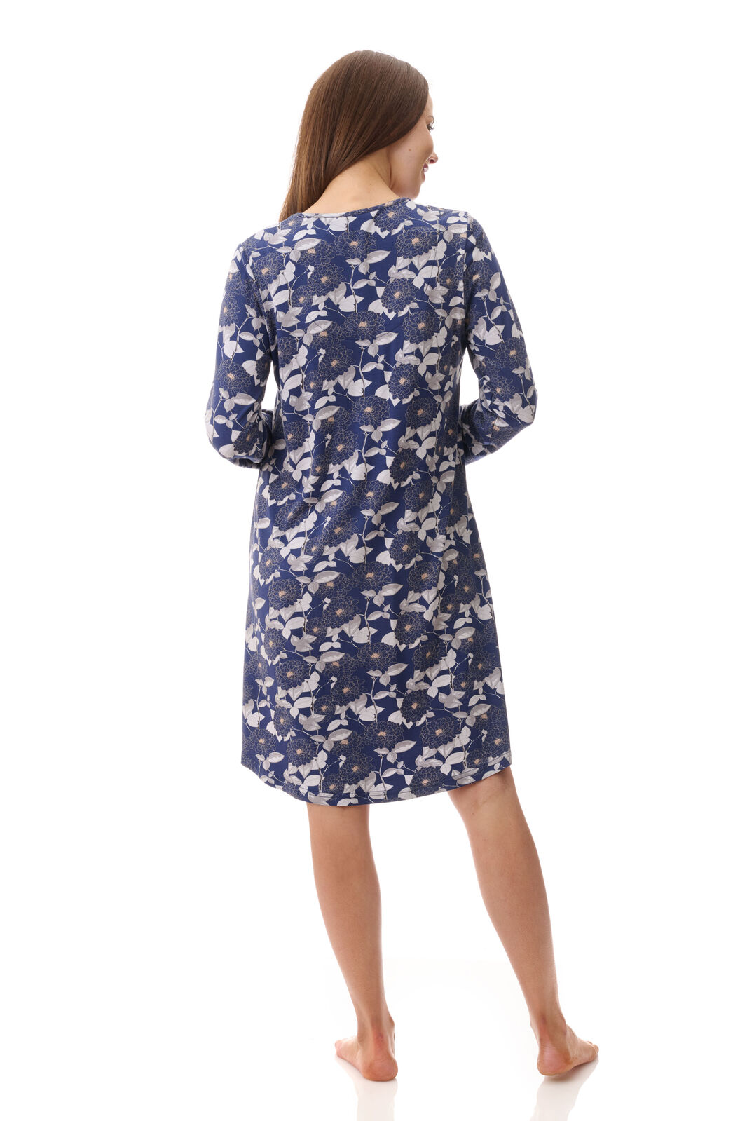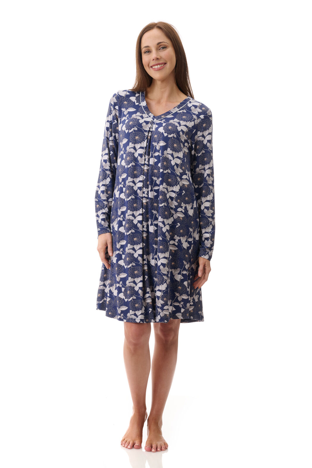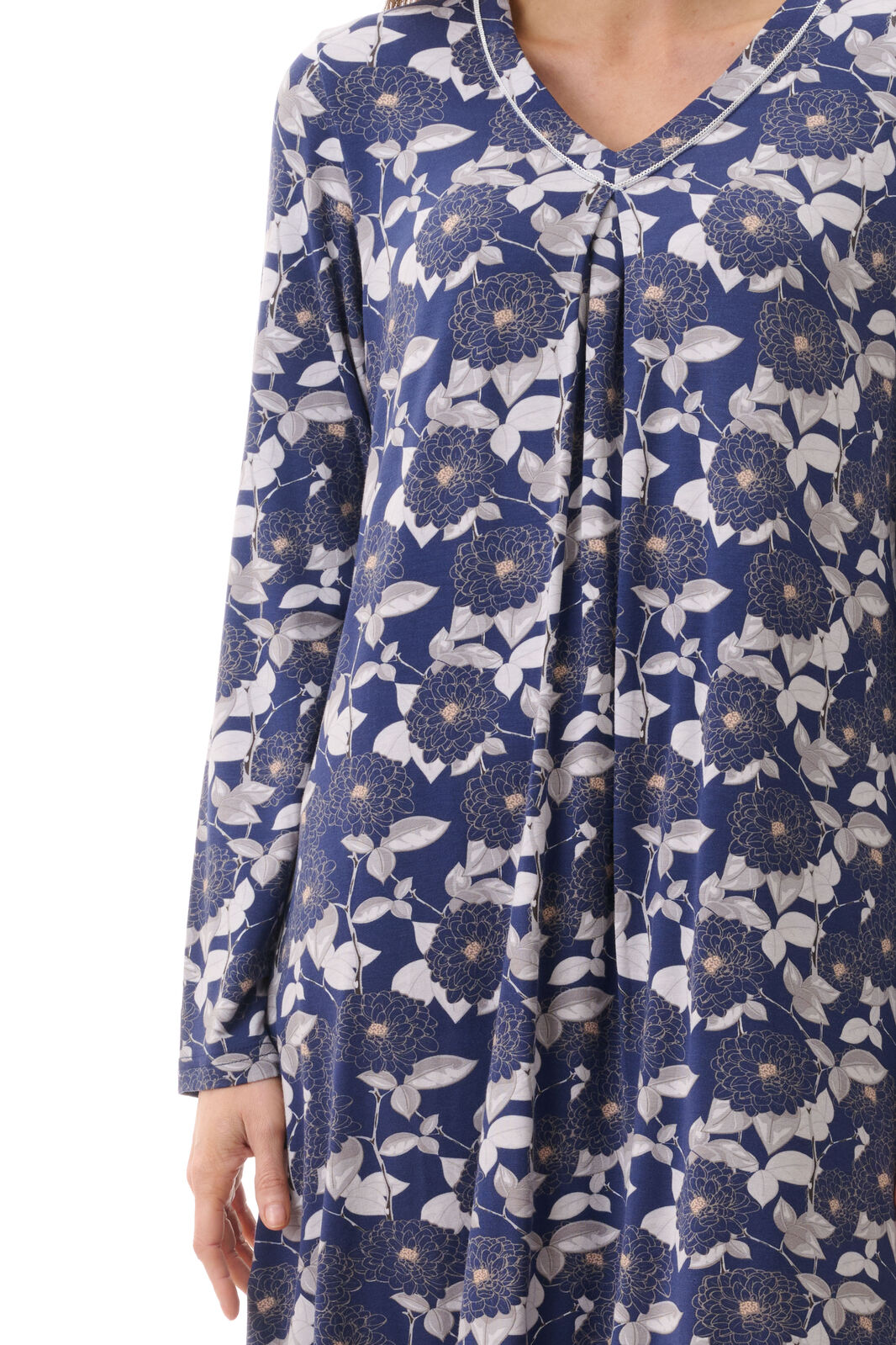 • Knee length nightie with long sleeves in the striking navy based print "Coco".